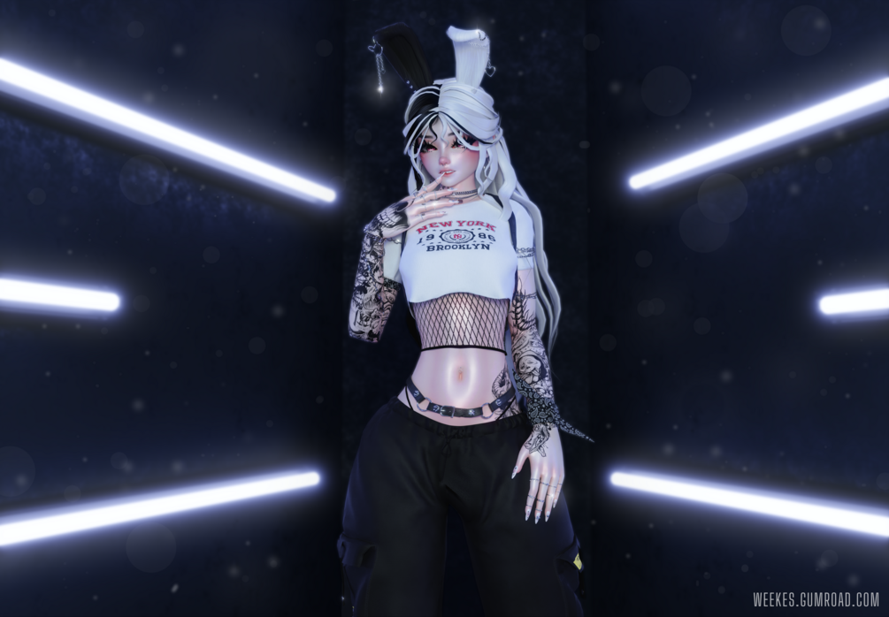 ⋄ Materials ⋄ Glasses tint - Skin tone slider - 5 Hoodie textures - 5 Sweatpants textures - 6 T shirt textures - 8 Crop top tex - 6 Sneaker textures - - 6 Crop top textures - 8 Hat textures - Left & right Eye hue - Hair Emission - Hair saturation - Hair Hue - 5 Different hair colours left & right - Tattoos - Skin tone slider - Main hue