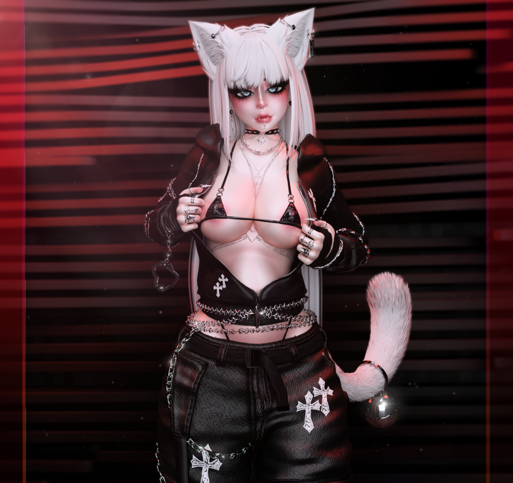 Dissolve toggles Crop top, Small top, Fishnets, oversized sweater, hoodie , puffer vest, bikini top, belt jeans, Shorts, Cargos, Joggers, Latex dress, Latex skirt, Bikini bottom, Fishnet bottoms, Thigh socks, Arm sleeve, Wraps, backpack, Butt harness, Choker, Cuffs, Necklace, Corset, Pasties, Watch, Chains arm, Chain harness, Chain belt, Chains leg, Glasses, Facial piercings, Face mask, Mouth chain, Bone gag, Blindfold, Trucker hat trucker hat, Bucket hat, Cop hat, High tops, lows, boots, heels, ankle socks